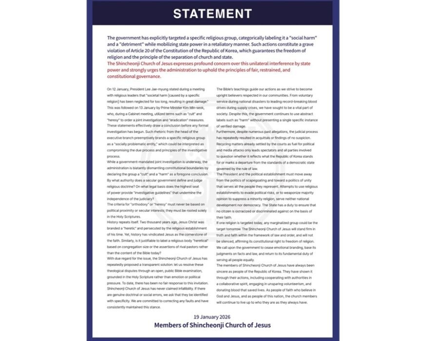 The Statement of Shincheonji Church of Jesus